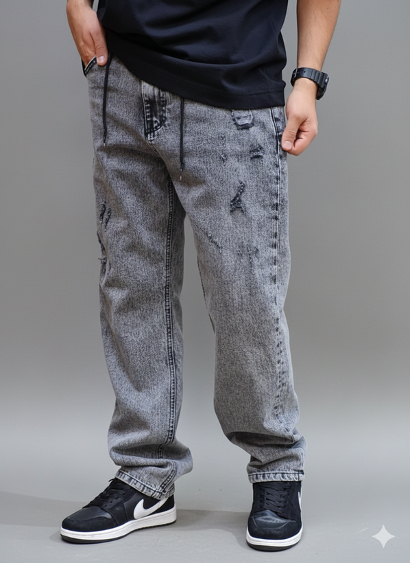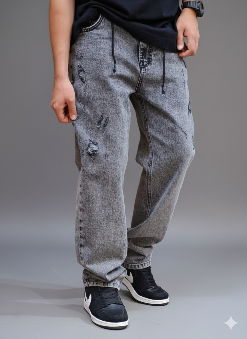 شلوار جین نیم بگ پارچه ترک طوسی زاپدار